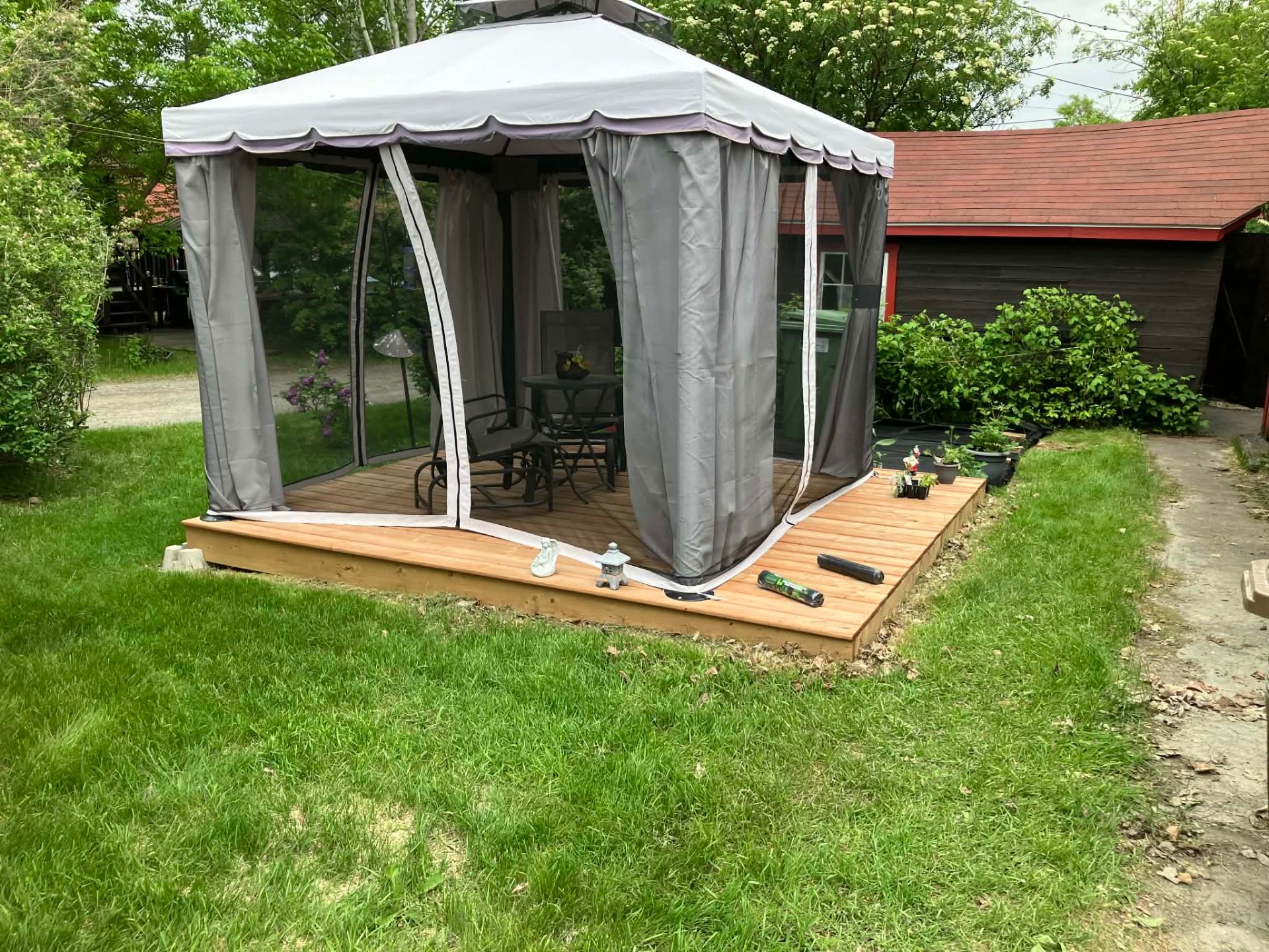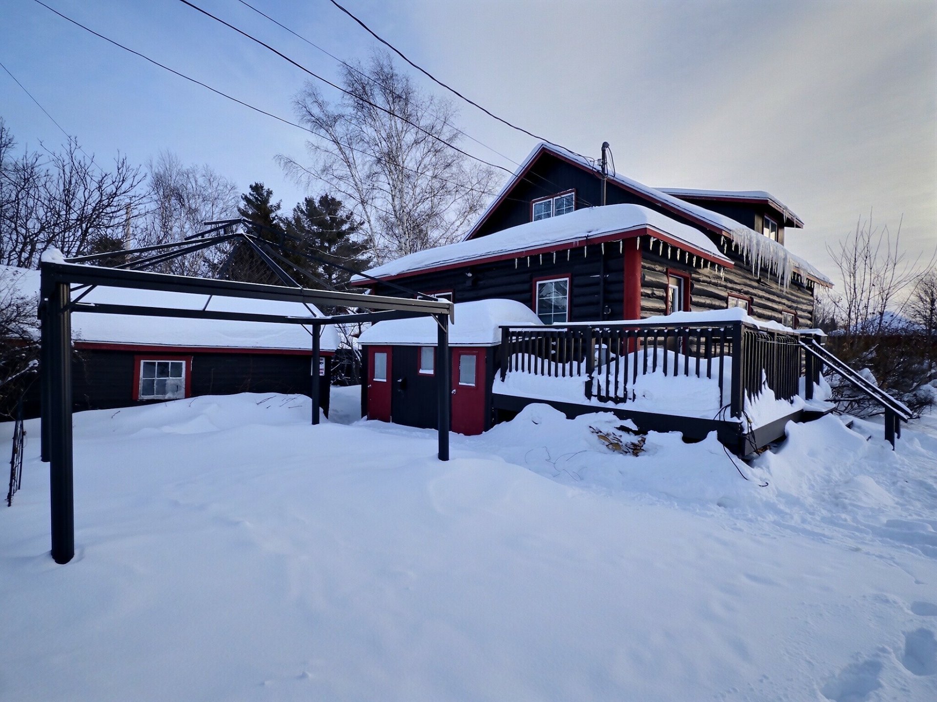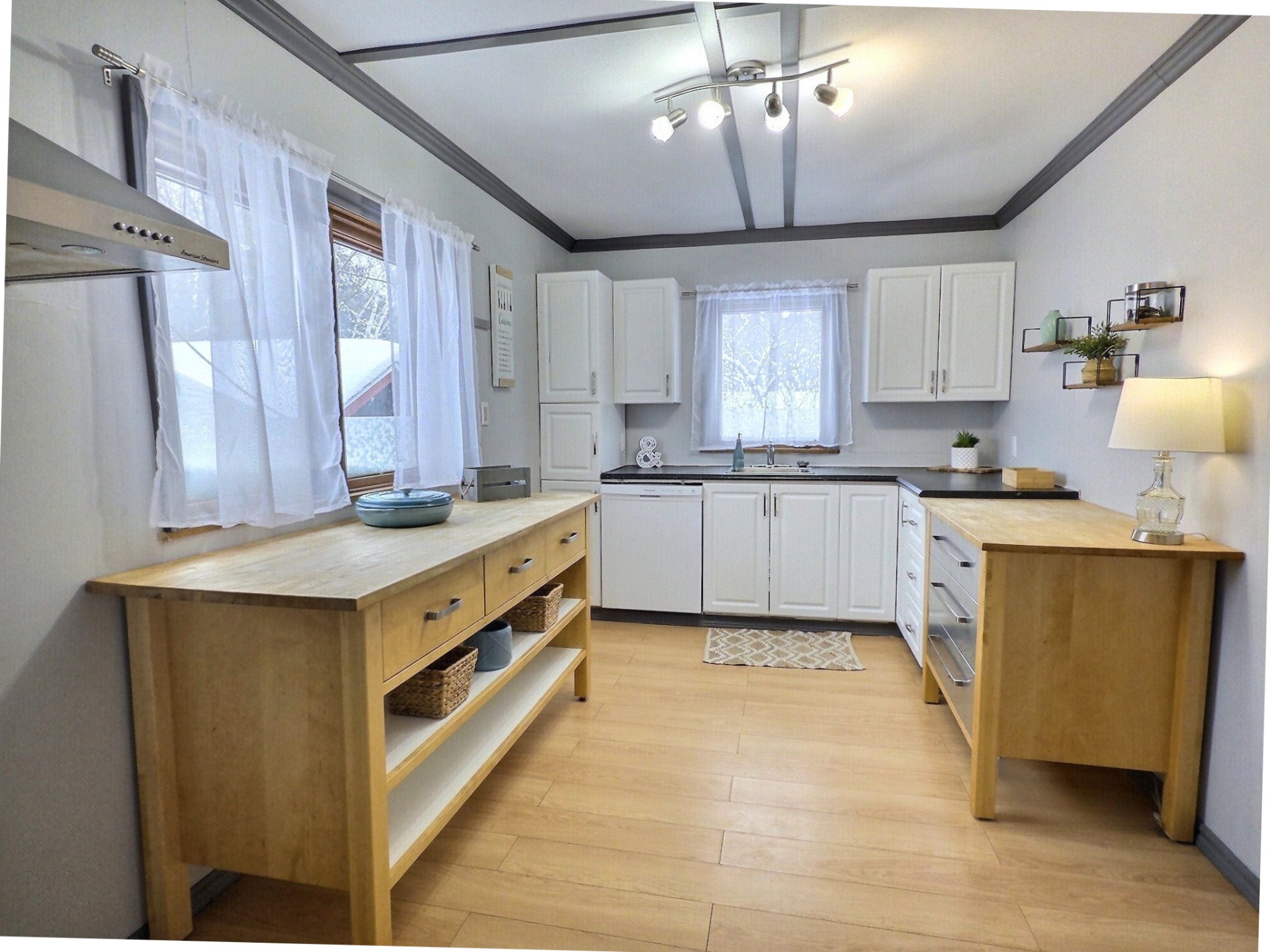 | Inclus | Luminaires, lave-Vaisselle, laveuse-sécheuse, 2 îlots de cuisine (Bois stainless), changeur d'air, gazebo avec toiles et moustiquaires, souffleuse, tous les stores, rideaux dans la verrière, bac bleu, bac vert, bac brun. |