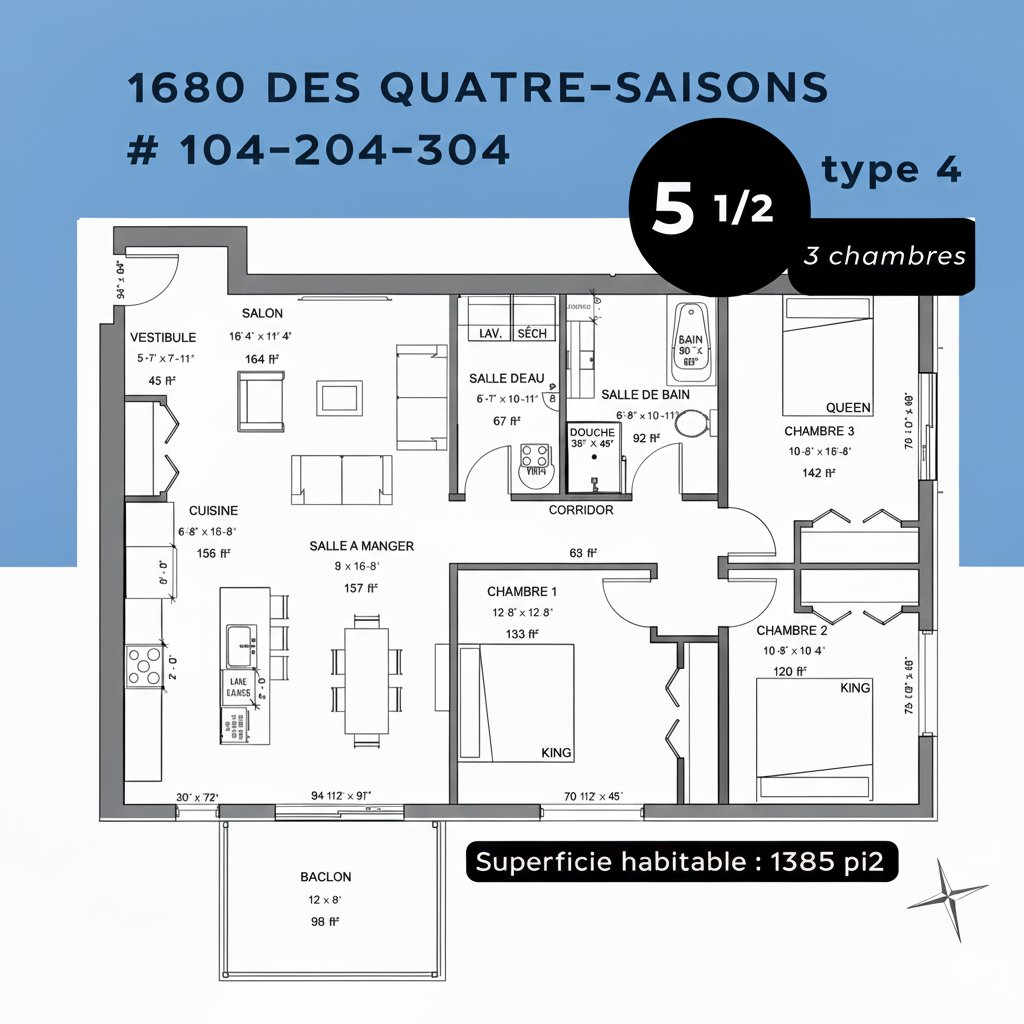 Versants-du-Parc -- Condos locatifs Rue des Quatre-Saisons, Sherbrooke. Appartements modernes et lumineux offrant un confort supérieur. Inclus : 1 stationnement int. et 1 ext., espace de rangement et ascenseur. Cuisine avec îlot central, fenestration abondante, balcon spacieux et salle de lavage indépendante (5 ½). Douche vitrée, bain indépendant, thermopompe murale et excellente insonorisation. Entretien complet, conciergerie sur place et sécurité par caméras. À partir de 1700$/mois. Animaux acceptés sous conditions. Enquête de crédit obligatoire. À noter que les logements disponibles peuvent correspondre à d'autre unité.