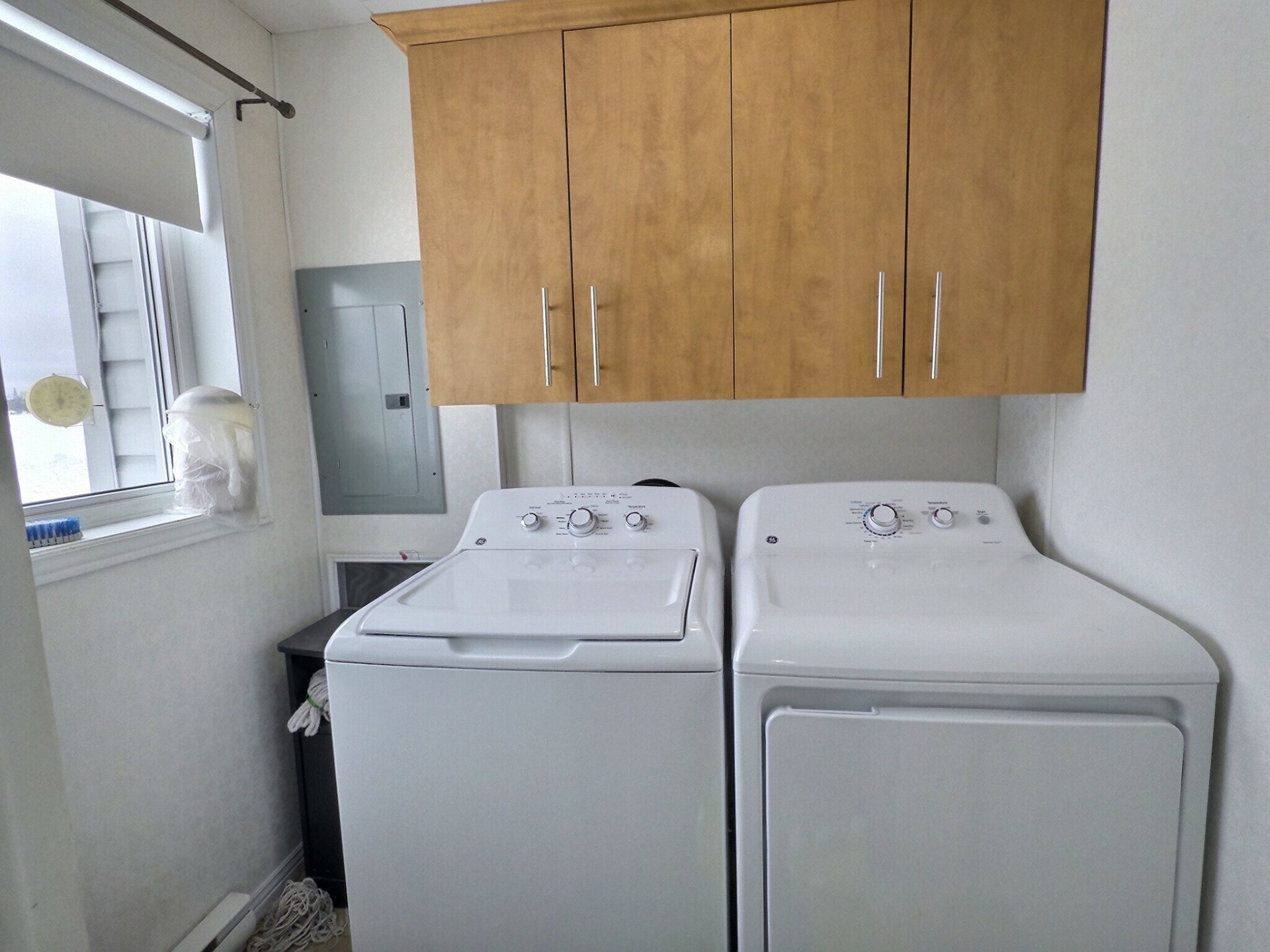 Inclus Luminaires, bac vert bac bleu, système de batterie pour la pompe, réfrigérateur et congélateur (dans l'armoire de la salle de lavage du bas), Logement du bas: laveuse-sécheuse, poêle, réfrigérateur, table et chaises cuisine, 2 divan-lits, lit simple.