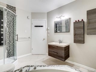 Salle de bains avec bain podium en coin. Vanité suspendue.